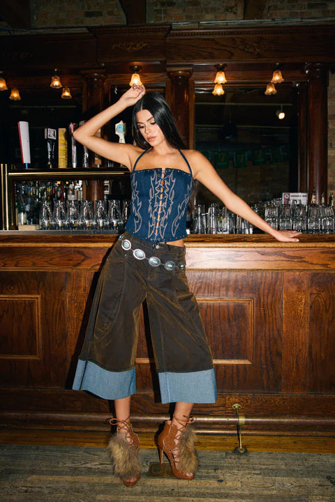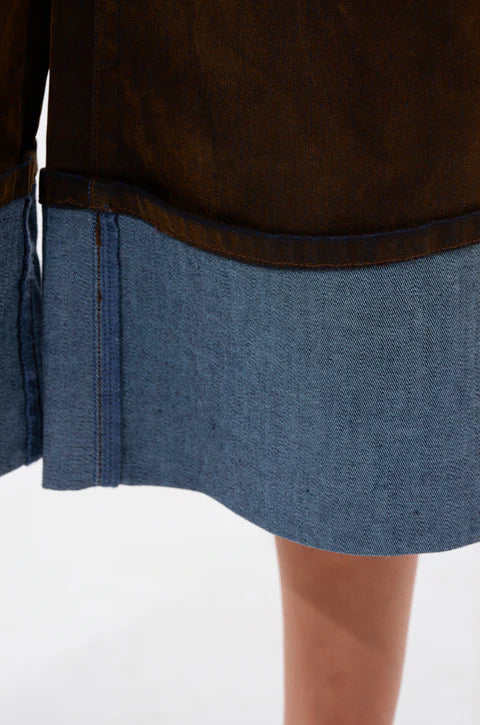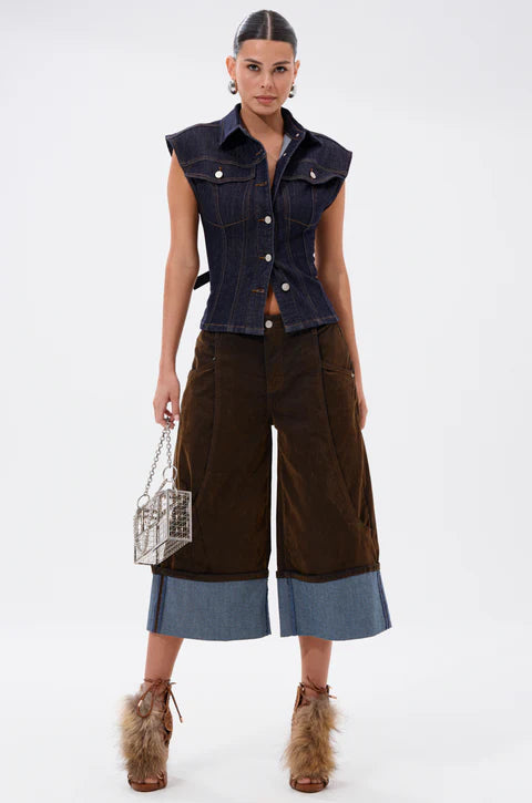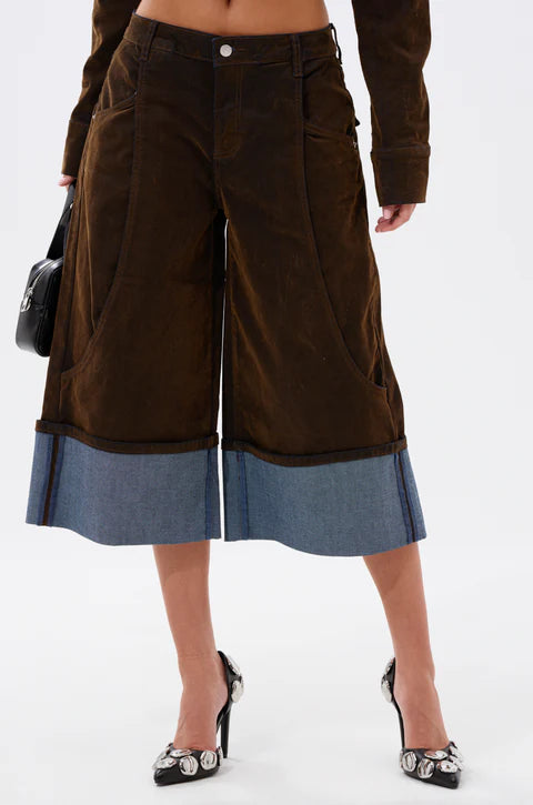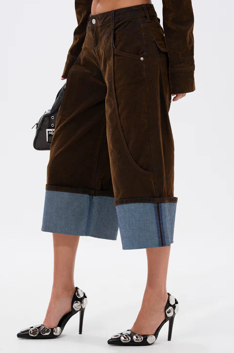 Crafted from soft, velvety brown denim with subtle stretch, this look redefines fall fashion. The oversized wide-leg shorts and matching button-down shirt create a structured yet relaxed silhouette — equal parts edgy and refined. Unique seam details, cuffed hems, and a tailored waist buckle add a designer touch 🌟 Perfect for styling with heels or boots for that effortless model-off-duty vibe 😎