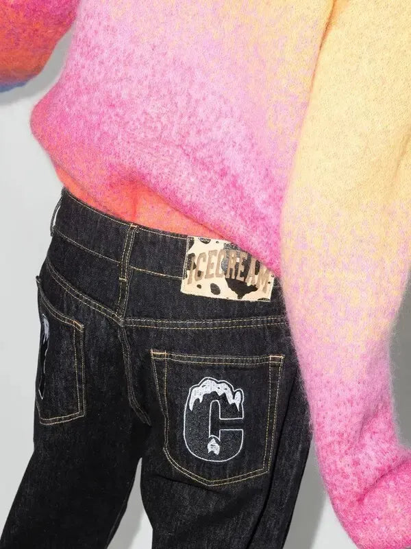 Running Dog straight leg jeans from featuring black, cotton, contrast stitching, graphic print to the front, patch detail, mid-rise, button fly fastening, belt loops, classic five pockets and straight leg.